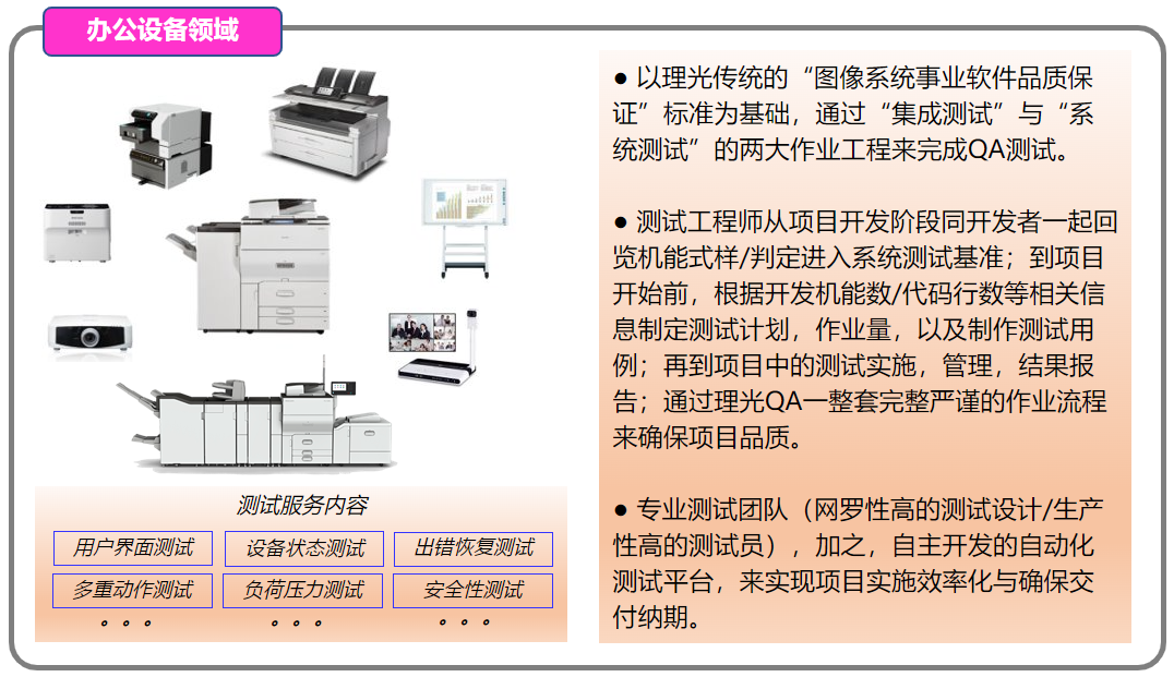 测试业务开始于2004年,最初起步阶段,以承接理光集团研发生产的办公设备产品的软件测试为主,通过十多年的发展,测试领域不断扩大,目前已经衍生到了智能终端/PC端的APP产品,以及,解决方案产品。