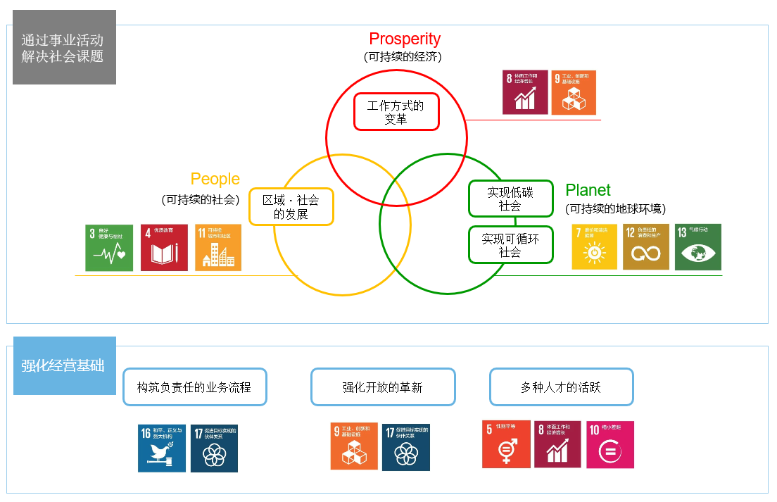 对于理光集团来说,理想的可持续发展社会是在 "繁荣"、"人"、"地球 "三者之间保持平衡的社会。为了创造这样的社会,我们将根据理光集团的 "使命宣言"、"中期经营计划"(MPT)和利益相关者的期望,通过业务来解决社会问题。